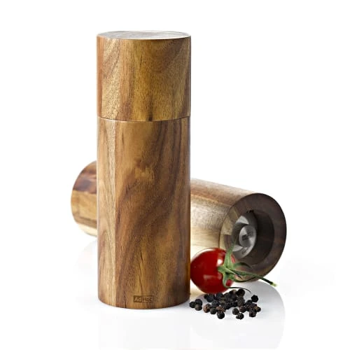 Moulin en bois d’acacia avec broyeur céramique haute performance. Réglage progressif du broyage, de fin à grossier. Partie supérieure amovible pour le remplissage.