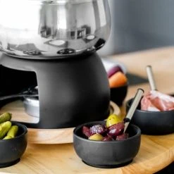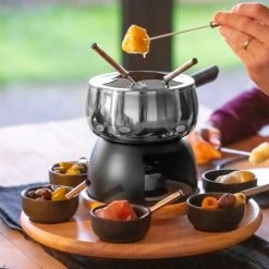 Cet ensemble est spécialement conçu pour le partage grâce à sa tablette tournante sur laquelle vous pouvez poser les petits bols inclus, remplis de sauces ou de légumes. Il comprend toute une série d’accessoires pour le dîner : six fourchettes et cuillères, un brûleur et un plateau tournant en bois naturel pour que les invités puissent partager et se régaler en toute simplicité.