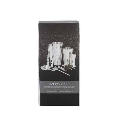 Le set comprend un shaker de 750 ml, une passoire, un double doseur (25 ml et 50 ml), une pince à glaçons, une cuillère à mélanger, un décapsuleur et deux verseurs avec joints en silicone étanches.