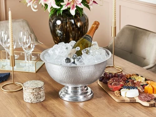 Seau de service pour bouteilles. Ce seau à glace décoratif en métal est le choix idéal pour les intérieurs glamour. Il sera parfait pour garder une ou plusieurs bouteilles au frais en même temps.Détails: Type de produit: Bol décoratif Style: Moderne Couleur principale: Argenté Type de matière: Métal Matière principale: Aluminium Finition: Brillant Fabriqué à la main: Oui Dimensions: Profondeur: 36 cm Largeur: 36 cm Hauteur: 22 cm Poids: 1 kg L`offre inclue: 1 x Coupelle Caractéristiques clés: Fabriqué à la main avec le plus grand soin, Style chic, Finition à la fine pointe de la mode, Décoratif et fonctionnel, Style élégant Informations d`assemblage: Ne nécessite pas d’assemblage Informations supplémentaires: Chaque produit est fait à la main, il pourrait donc y avoir des différences de texture et de couleur. Ce sont des caractéristiques d’authenticités du matériau et ne sont en aucun cas considérés comme un défaut. Conseils de maintenance: Métal: 1.Pour éviter les rayures, n’utilisez pas de nettoyants abrasifs 2. Nettoyez avec un chiffon et un détergent doux, essuyez bien ensuite 3.Pour les éléments en cuivre ou chromés, utilisez un produit de polissage spécial.