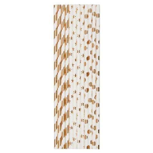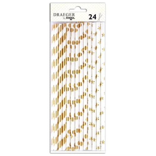 Assortiment de 24 pailles décoratives et alimentaires. 3 designs différents x 8 exemplaires. Blanc et or à chaud. Respectent les normes alimentaires. Hauteur d’une paille : 19,5 cm.