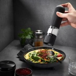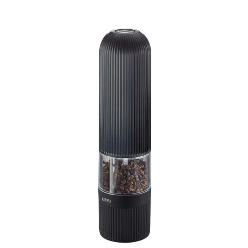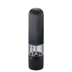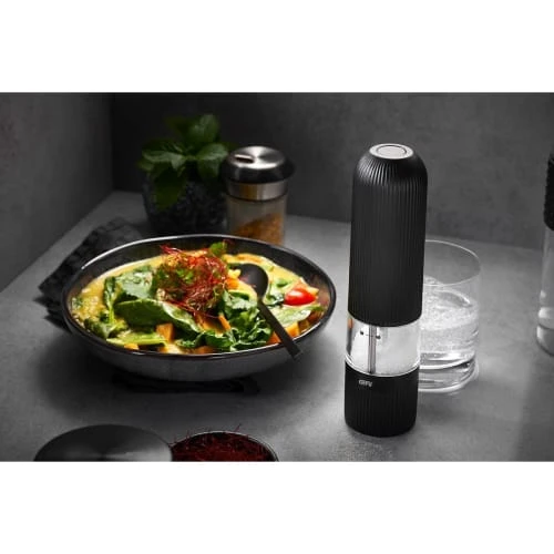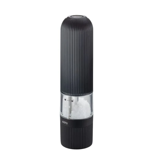 Assaisonnement parfait sur simple pression d’un bouton : le moulin à sel et à poivre électrique intemporel et élégant SPEZIA est un point culminant visuel pour chaque cuisine moderne et impressionne en même temps par sa haute fonctionnalité. Appuyez simplement sur le bouton de démarrage intégré et le moulin en céramique de haute qualité réglable en continu garantit des résultats de mouture parfaitement dosés et merveilleusement uniformes, de fin à grossier.- Mécanisme de broyage en céramique réglable en continu- Mouture sans effort sur simple pression d’un bouton- Éclairage LED intégré- 6 piles AAA fournies- Récipient de stockage pour 40 g de grains de poivre ou 80 g de sel- Matière principale : ABS- Garantie : 5ans