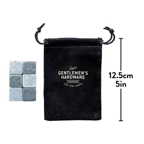 Ensemble de 6 pierres à whisky en granit et stéatite, idéal pour garder les boissons au frais. Il suffit de les placer au congélateur pendant quatre heures avant de les utiliser. Les pierres sont vendues avec une pochette de rangement en tissu. Dimensions : 9 x 9 x 2.2cm – Matière : granit