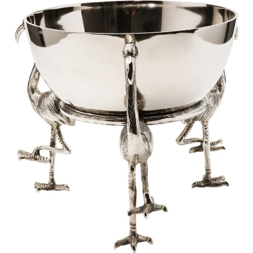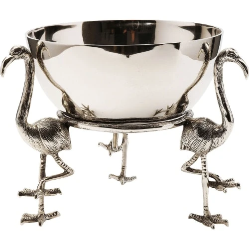 Cette coupe est perchée, comme un roi sur un trône, sur trois flamants roses chacun dans la pose typique de cet oiseau, perché sur une patte. Elle peut servir de seau à champagne, de coupe à fruits ou encore de vase. Non adapté au lave-vaisselle et au micro-onde.