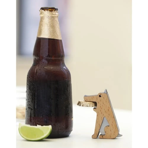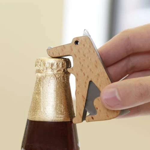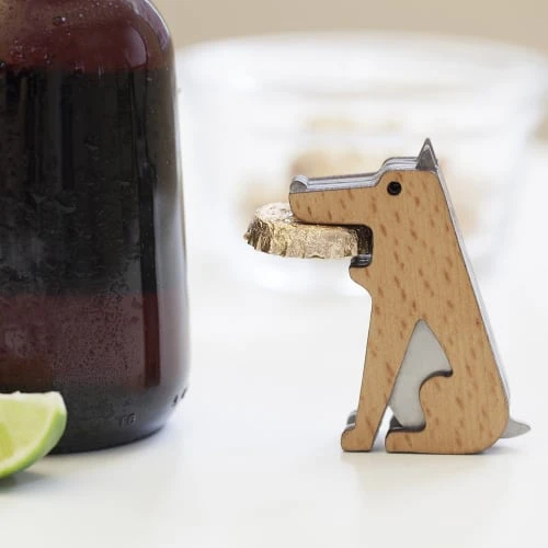 Allez, va chercher la capsule ! Ce chien décapsulera tout ce qui lui tombera sous ses dents aimantées. Matières : bois et inox