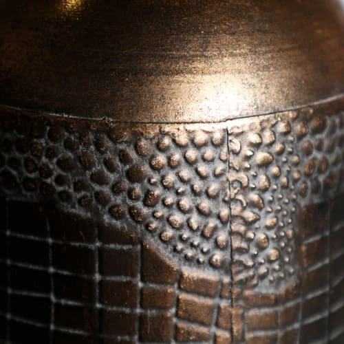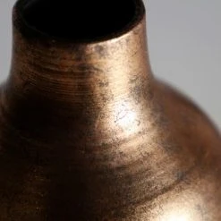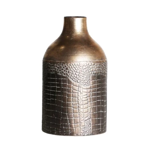 Bouteille décorative en acier, appartenant à la famille des vases / centres, couleur or antique, style art déco. Mesures : 16 longueur x 16 largeur x 30 hauteur et poids 0,5 kg.