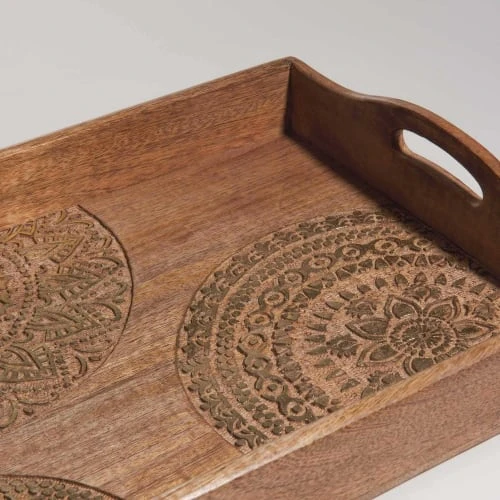 En quête d’une déco dépaysante et qui invite au voyage ? Succombez au plateau en manguier motifs sculptés dorés MANDALA. Pratiques grâce à ses poignées, il vous permettra de transporter verres, tasses, plats ou assiettes lorsque vous recevez à moins que vous ne préféreriez vous en servir comme objet déco à part entière ou comme support pour poser vos magazines. Quoi qu’il en soit, ce plateau offrira à votre espace de vie une touche exotique et authentique qui vous plongera au cœur de l’Inde. Un coup de cœur !