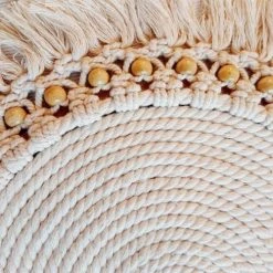 Set de table rond en corde de coton, franges et perles de bois. Ce set de table fait par les artisans de Bali à la main donnera un esprit frais et naturel à votre table. Il est idéal pour tous les styles de décoration ( contemporain, bord de mer, ethnique, scandinave, campagne et ctr ). Le prix est indiqué par pièce. Matière : corde de coton, perles de bois.