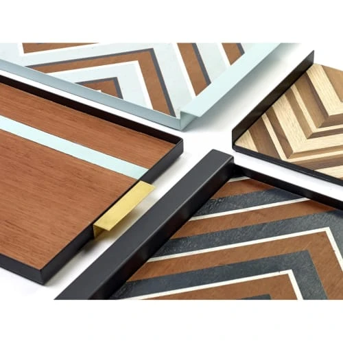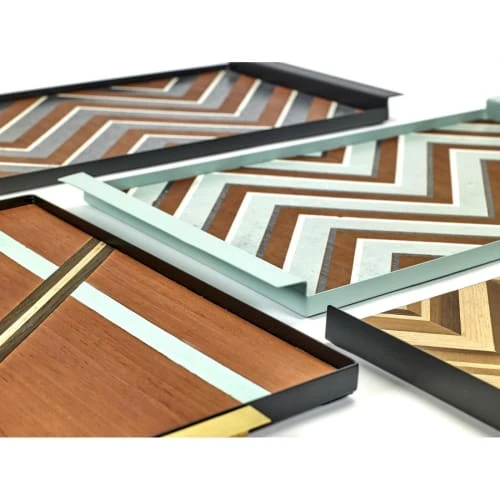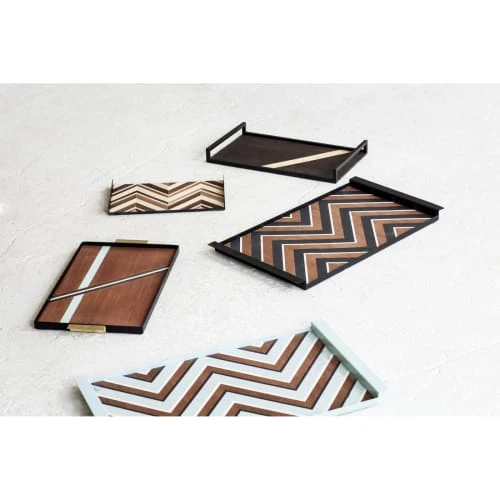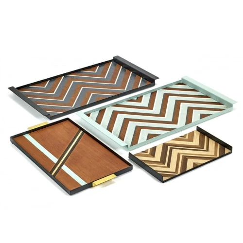 Plateau Grint Piece Messing édité par SeraxUn plateau au contour en métal noir et poignées laiton, fond en bois clair avec motif géométrique contrasté pour un magnifique aspect rétro moderne !On aime ce plateau Très Chic !