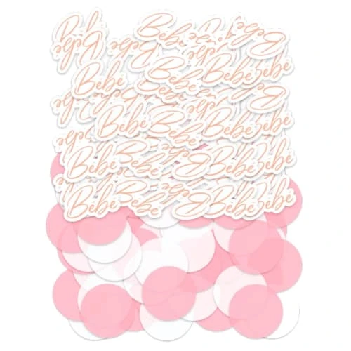 Duo de dĂ©coration bĂ©bĂ© et pastilles en papier rose et blanc Ă parsemer sur la table Ă l’occasion d’une baby shower, d’un baptĂŞme ou d’un 1er anniversaire.