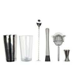 Ce set pour réaliser des cocktails sera du plus bel effet dans votre bar. FICHE TECHNIQUE- Set à cocktail.- Couleur : Argent.- Matière : Acier Inoxydable, Verre et Plastique.- Contient 5 accessoires.- Un shaker, un jigger, une cuillère de bar, un pilon et une passoire de bar 4 crochets.- La passoire de bar est conçue pour filtrer vos boissons et garder les glaçons dans votre shaker.- Le jigger vous permettra de doser votre cocktail.CARACTERISTIQUES TECHNIQUES- Dimensions du coffret : Longueur 32 cm x Largeur 9 cm x Epaisseur 25 cm. – Poids : 1,03 kg.