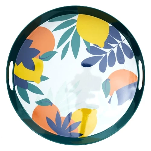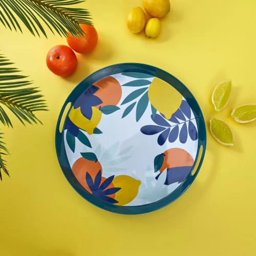Présentez avec bonne humeur et élégance vos plats grâce à ce plateau. Avec son imprimé d’agrumes, notre plateau apportera une touche de couleur sur votre table ou dans votre cuisine.FICHE TECHNIQUE- Plateau de présentation.- Imprimé Agrumes.- Couleur : Vert, Jaune et Orange.- Gamme : Rio.- Matière : Mélamine.CARACTERISTIQUES TECHNIQUES- Dimensions : Diamètre 38 cm x Hauteur 4.20 cm.- Poids : 0,650 kg.