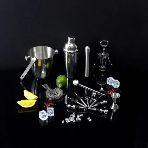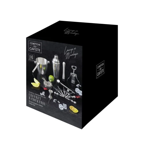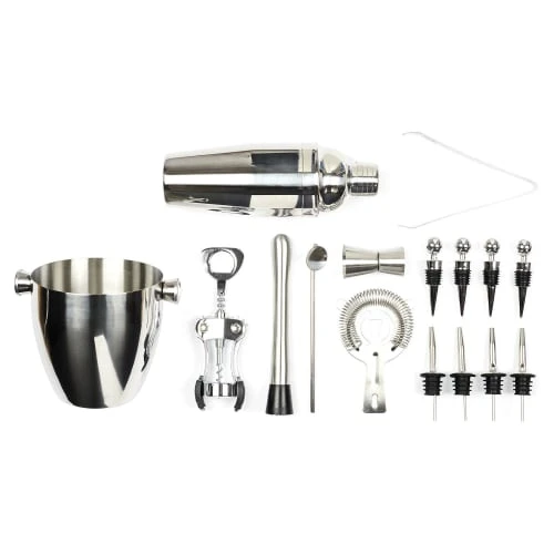 Ce set pour réaliser des cocktails sera du plus bel effet dans votre bar.FICHE TECHNIQUE- Set à cocktail.- 16 accessoires fournis.- Usage en extérieur adapté.- Matière : Acier inoxydable.- Comprends 1 shaker de 750 ml, 1 passoire, 1 pince à glaçons, 1 pilon, 1 cuillère à cocktail, 1 seau à glace, 1 verre doseur, 1 tire-bouchon, 4 bouchons bec verseur et 4 bouchons.CARACTERISTIQUES TECHNIQUES- Dimensions de la boite : Longueur 14 cm x Hauteur 19.50 cm x Profondeur 14 cm.- Poids : 0,815 kg.