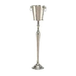 Seau à Champagne ou seau à vin sur pied. Ce set comprend le socle sur pied et le seau à champagne conçu pour le socle. Ce seau à champagne sur pied est indispensable pour désencombrer les tables et apporter une touche très professionnel à vos dîners. Le seau à champagne ainsi que le pied présentent des lignes très épurées qui font tout le charme de cette pièce. Dimensions: Diamètre 23cm x Hauteur 108cm – Matière: Aluminium – Couleur: Argent