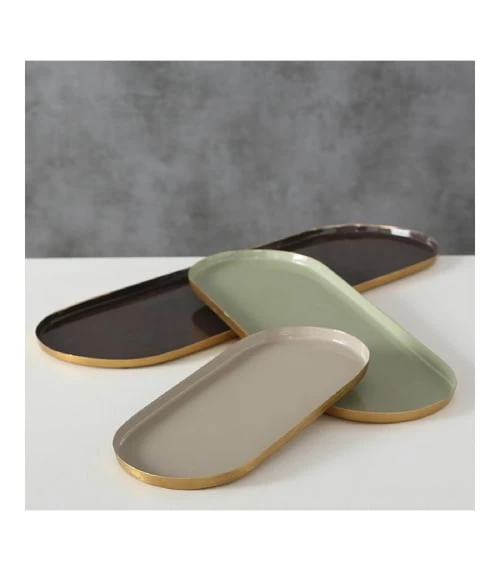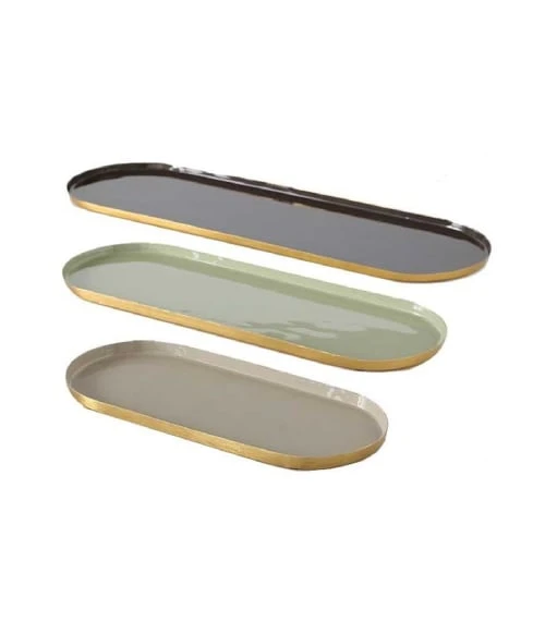 Set comprenant 3 plateaux avec base dorée et intérieur coloré laqué. Dimensions: Longueur de 31/41/51cm x largeur 14/16/18cm x Hauteur 1cm – Couleur: Multicolore – Matière: Métal