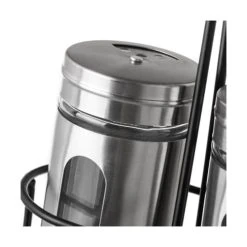 Set composé d’un support en métal noir et de porte condiments en métal argenté (sel, poivre). Dimensions: 12.5×6.5x15cm – Dimensions pot: 4.7×4.7×8.10cm – Contenance: 100ml – Matière: Métal – Couleur: Noir et Argenté