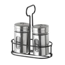 Set composé d’un support en métal noir et de porte condiments en métal argenté (sel, poivre). Dimensions: 12.5×6.5x15cm – Dimensions pot: 4.7×4.7×8.10cm – Contenance: 100ml – Matière: Métal – Couleur: Noir et Argenté